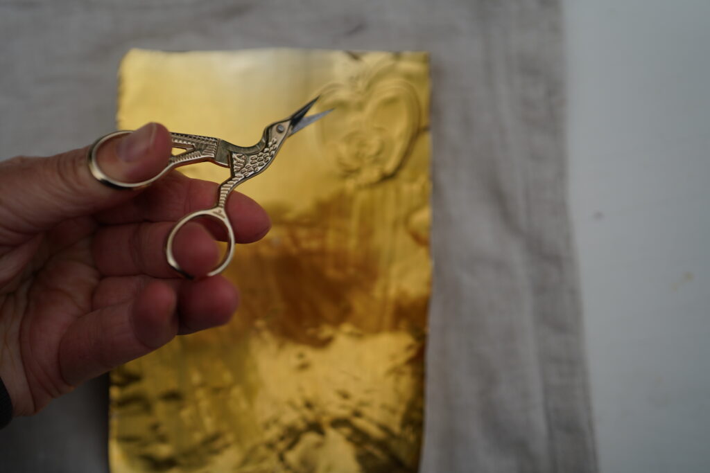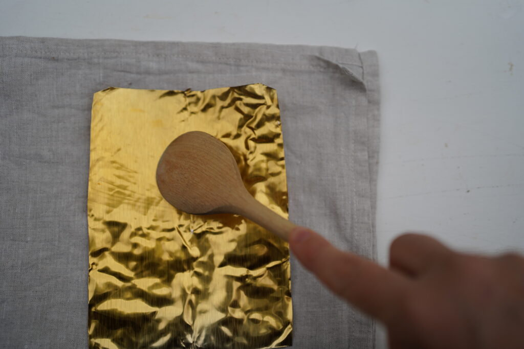 Aluminium glätten – Dafür lege ich das goldene Material auf eine weiche Unterlage – ich benutze hier einfach ein mehrfach gefaltetes Tuch. Mit etwas Druck reibe ich mit dem Kochlöffel über das Aluminium bis es schön glatt und eben ist.