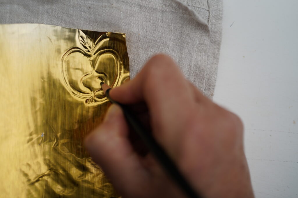 Prägen – Mit dem Prägewerkzeug das gewünschte Motiv mit sanftem Druck in das Aluminium drücken, sodass sich die Linien deutlich abzeichnen. Das Motiv kann vorher auf Papier vorgezeichnet werden – benutze gerne meine Früchte als Vorlage. Falls sich beim Prägen ein Fehler einschleicht, lässt sich das Aluminium mit einem Kochlöffel vorsichtig wieder glätten, um neu zu beginnen.