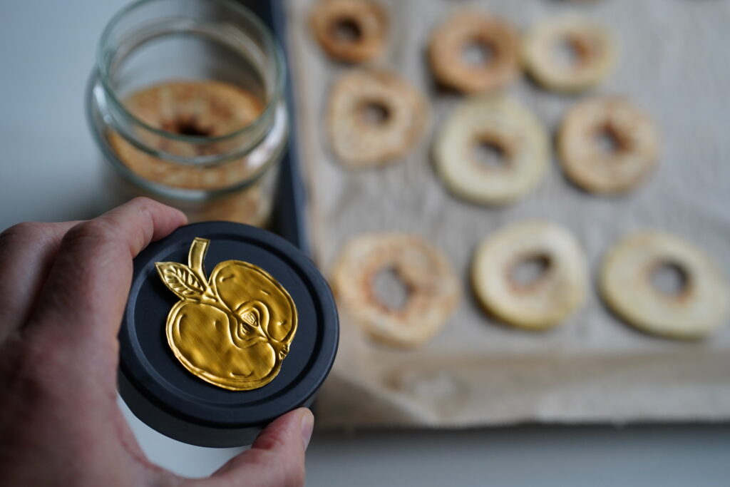 Die geprägten Motive lassen sich auf viele verschiedene Arten verwenden: Ich habe sie zum Beispiel auf den Deckel eines Glases geklebt und darin selbstgemachte Apfelringe verschenkt – eine schöne kleine Geschenkidee! Auch als Geschenkanhänger, als Deko auf dem Kaffeetisch oder aufgereiht als kleine Girlande machen sie was her. Natürlich kannst du die Motive auch auf Karten kleben – der Fantasie sind da keine Grenzen gesetzt.