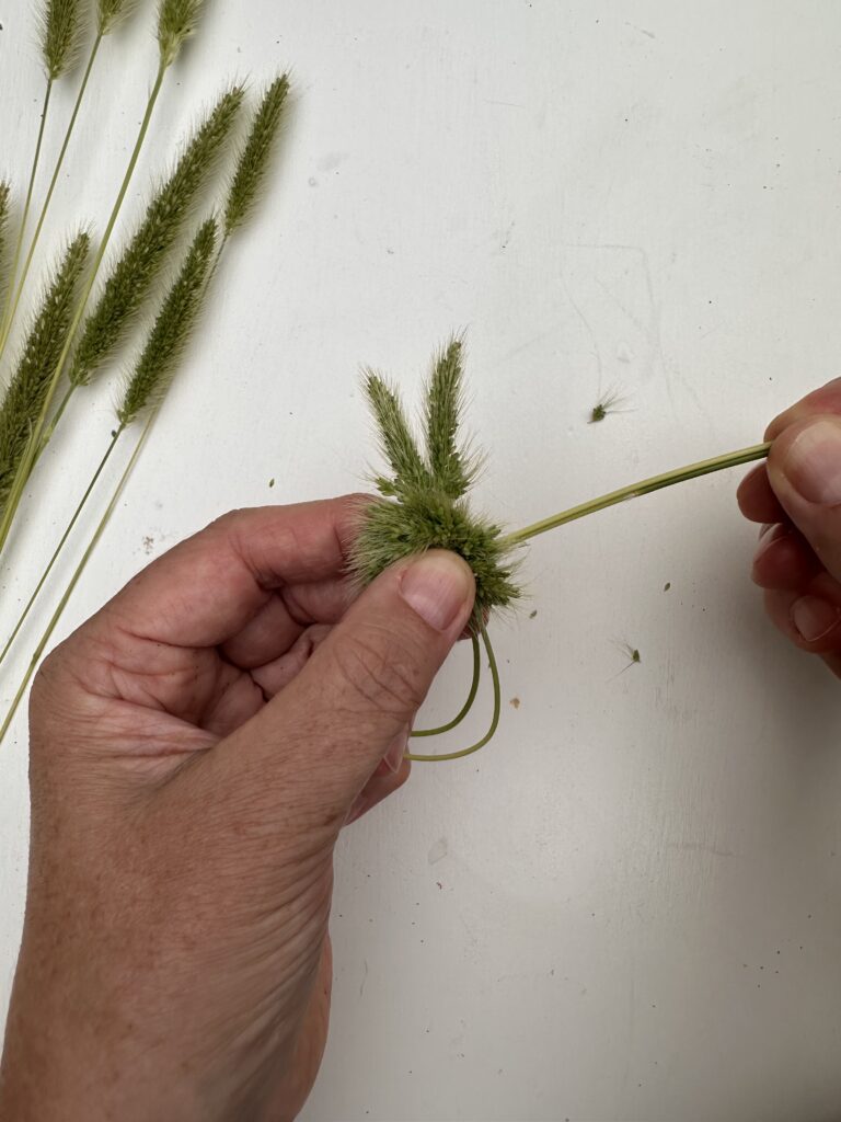 Der Knoten bildet den Kopf, und die beiden Spitzen der Ähren bilden die Hasenohren. Durch die „wuschelige“ Optik der Ähren ist der Knoten als solches gar nicht richtig sichtbar – es bleib also eine flauschige Kugel mit zwei Ohren zu sehen.