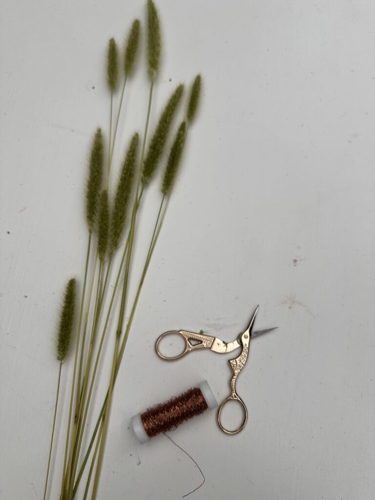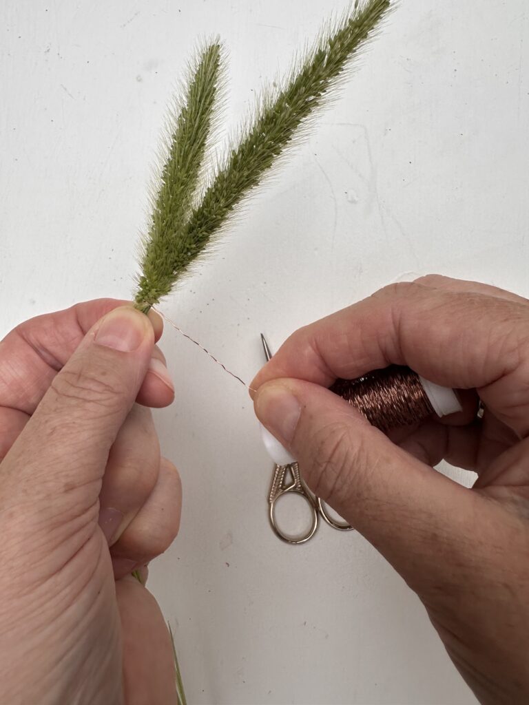 Lege zwei Stile eng nebeneinander und verbinde sie unterhalb der Ähre mit einem dünnen Draht. Wickle hierfür das Draht einfach ein paar mal drum herum und drücke das Ende fest an.