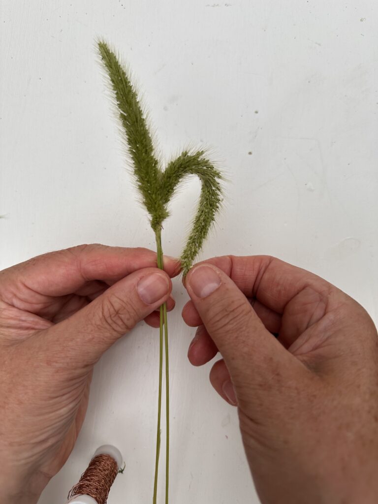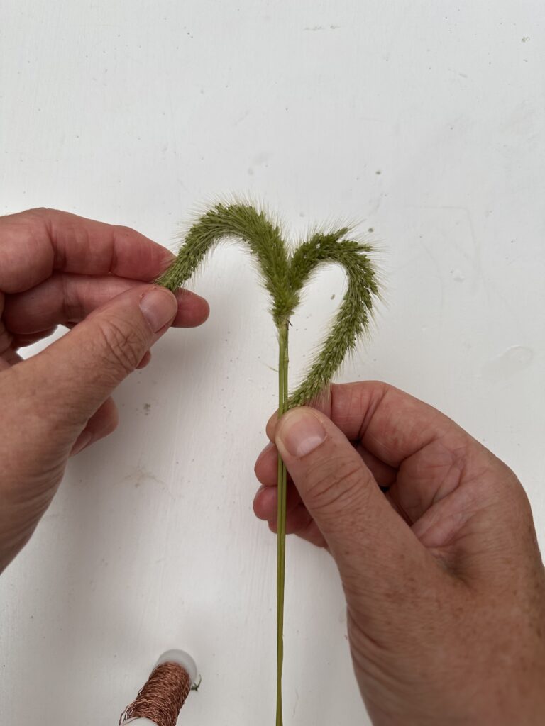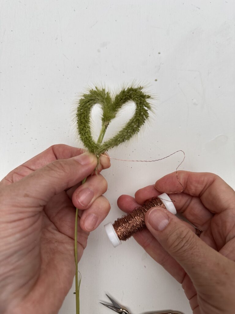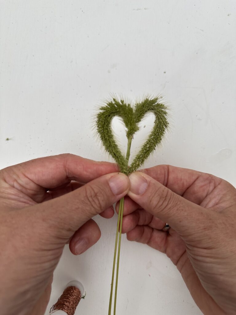Ziehe nun die beiden Grasenden runter an den Stil, so dass ein kleines Herz entsteht. – Nun kannst du die Spitzen ebenfalls mit dünnem Draht befestigen.